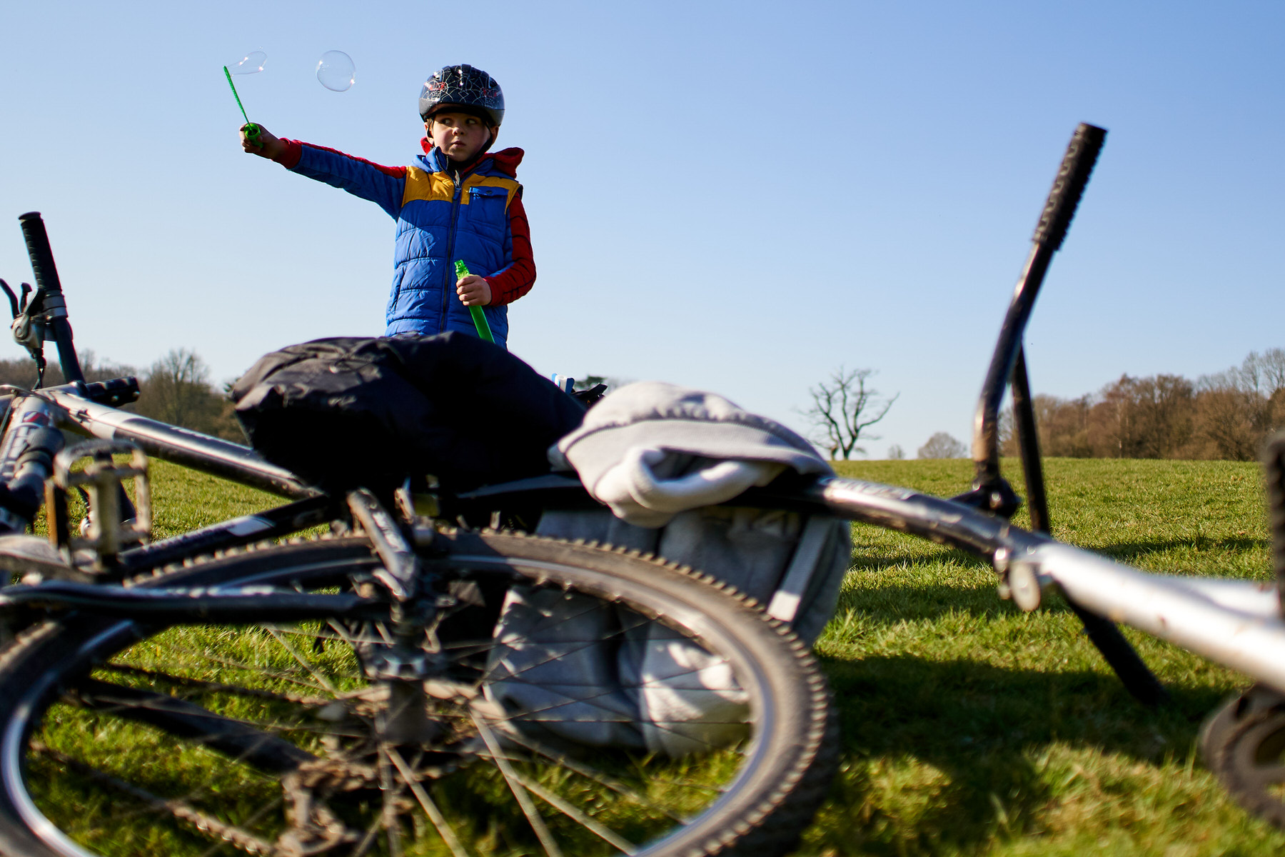 Having skipped the morning workout routine I suggested another bike ride and this time encouraged Eddie to join us. Once again the Rocket launcher came with us but in addition Rupert picked up a bottle of bubble fluid. It took about a minute for Rupert to come up with the idea of pouring the fluid into the launcher. Obviously I took great delight in the great pictures it made and I can still hear his demonic cackling laughter echoing in my head. I huffed and puffed my way up a steep hill with Eddie breezing up the rear on an electric hybrid bike, and nearing the top we came across one of Rupert’s schoolmates, had a little chat while maintaining some distance and then whizzed downwards to head home.