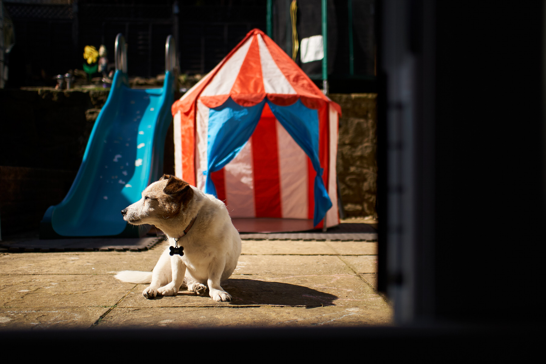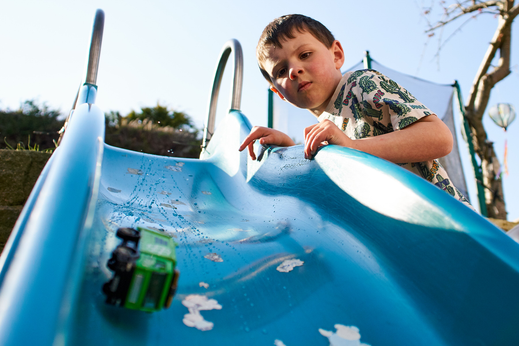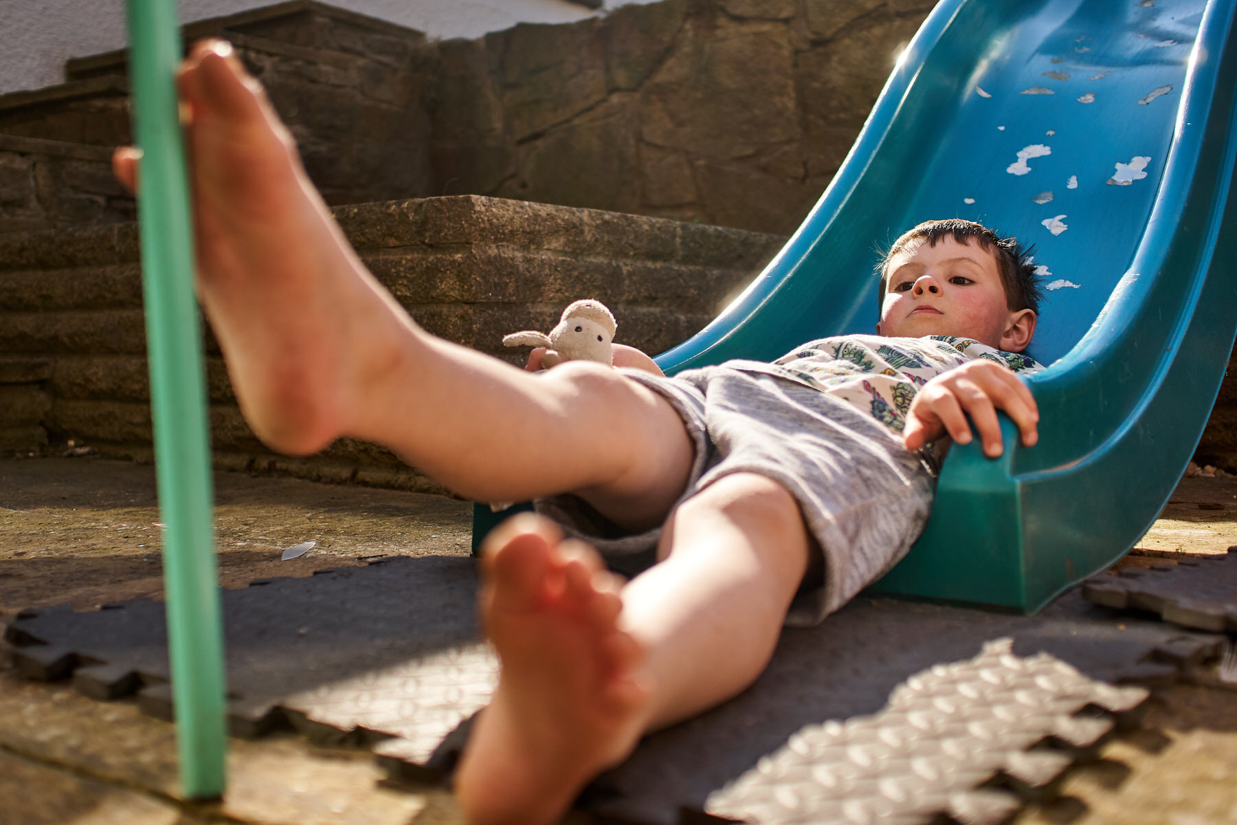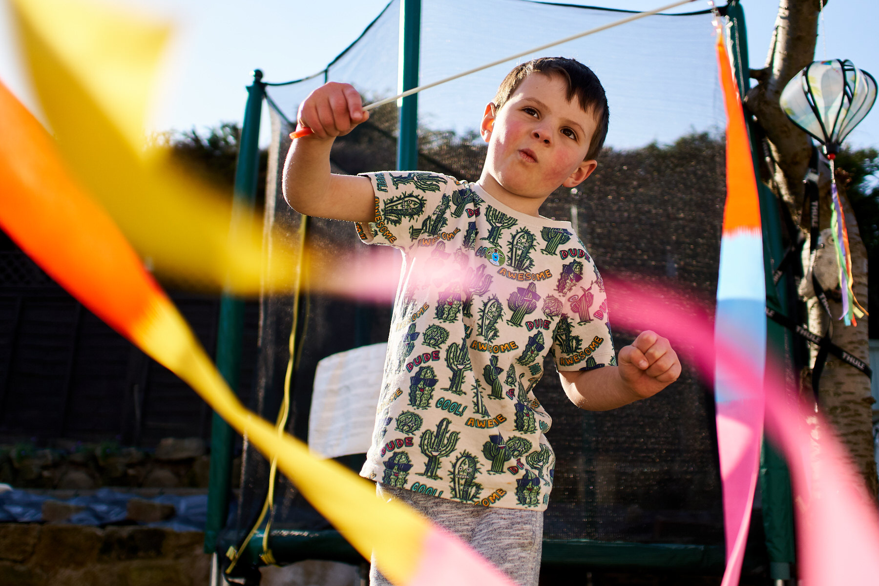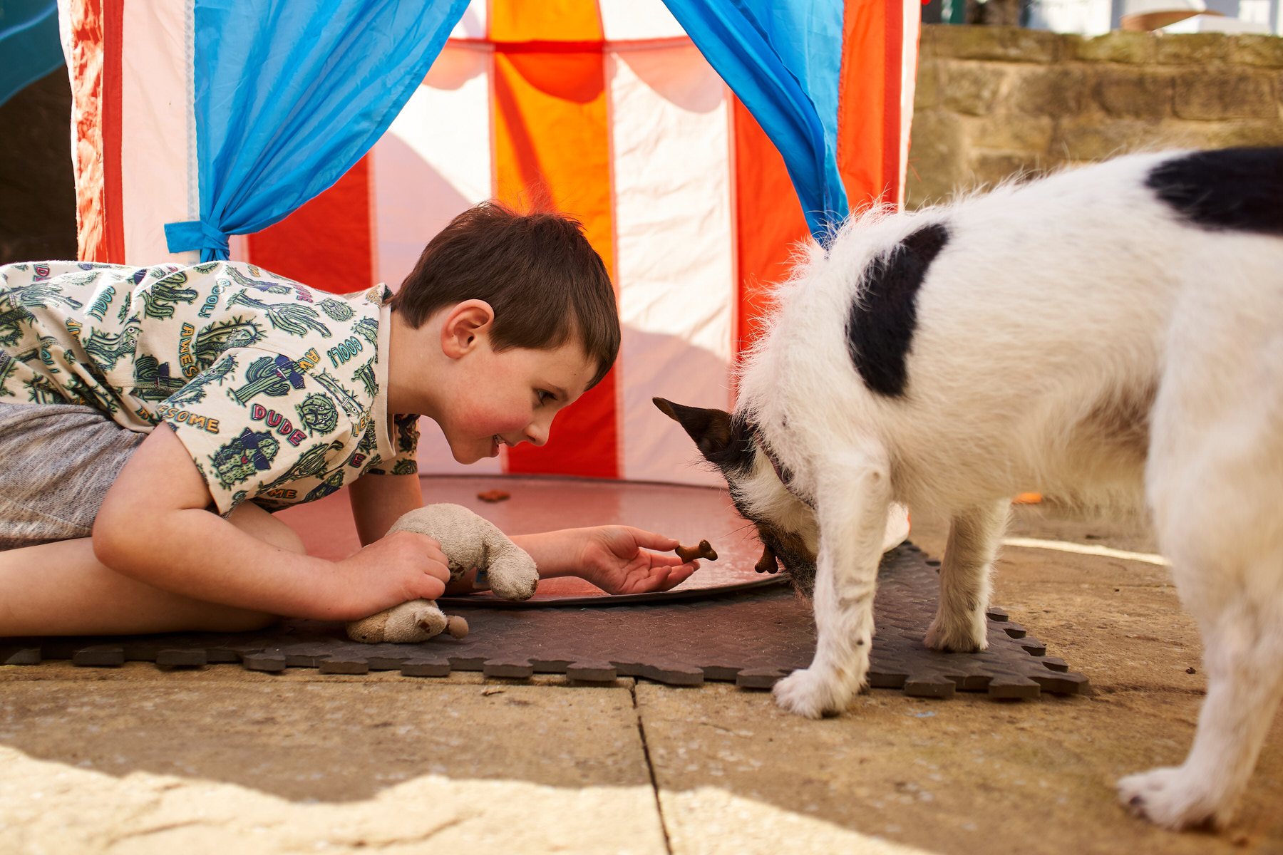 While the weather is still warm it’s been a case of enjoy it while we can. So apart from Rupert playing with 55 Hotwheels cars (he counted them all with me), some Bottle top artwork (more rainbow making) with Mummy and a bit of TV it’s mostly been an outside day again. Included in garden play was a one of the twirling wands that Helen got from amazon a few days back, it entertained him for quite a while. It’s not just us humans that enjoy the feeling of warm sunshine, both Holly and Barney are keen sun bathers. In the five years we’ve managed to bring up Rupert there has been a gradual respect for space between him and Holly. This is heartening to see as when he was first introduced to her it would have put the fear of the great almighty into anyone. She has always been a difficult dog to manage having had her from rescue, and whilst we had our doubts to begin with she brings me much joy with a certain comedy value. I’m pleased, because he now has a respect and love for dogs. With Barney it’s much better for Rupert, they both clearly love one another, and whilst Rupert is always cautious he frequently fusses him.